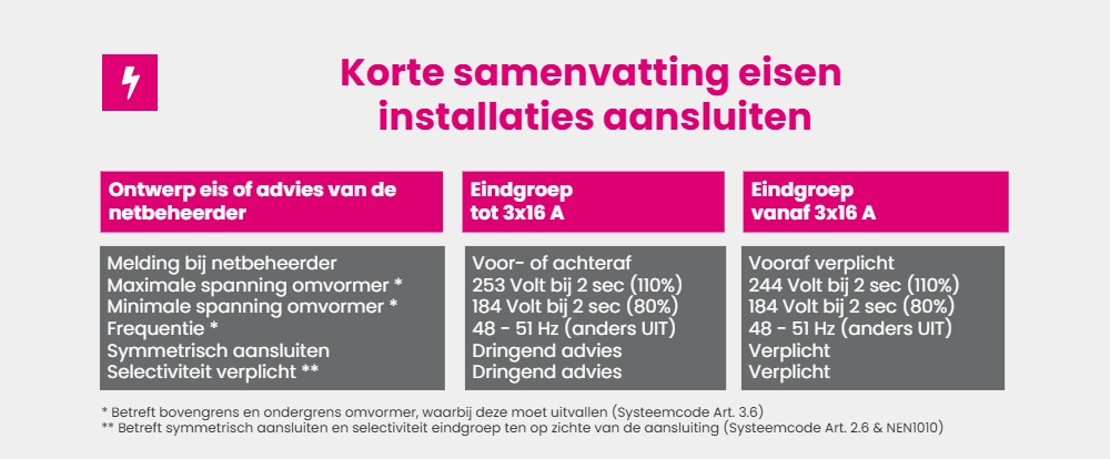 Als jouw installatie niet volgens de voorwaarden en eisen is aangesloten én deze veroorzaakt een storing op het elektriciteitsnet, dan kan de netbeheerder je verplichten om de installatie alsnog aan te passen (Systeemcode Art. 2.8). Ga dus voor in één keer goed en voorkom extra kosten.