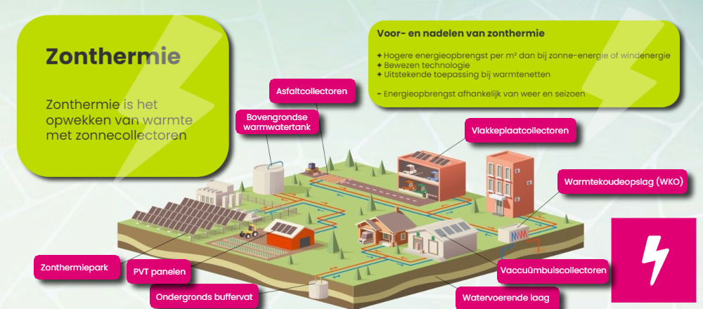 Zonthermie kan zowel kleinschalig als grootschalig worden toegepast voorziet in de warmtevraag. Zonnecollectoren zijn ook efficiënter dan zonnepanelen, waardoor ze een bredere inzetbaarheid hebben. Met slechts enkele zonnecollectoren kan een woning of gebouw volledig worden verwarmd. Seizoensopslag is ook mogelijk in combinatie met een warmtebuffer, die de warmte maandenlang kan vasthouden.